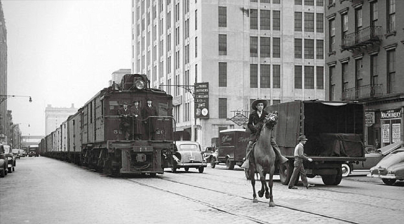 “Piétons, chevaux, carrioles, automobiles, camions, partagent la rue avec les trains qui circulent au beau milieu de la chaussée comme un banal tramway.” Le taux d’accidents engendrés par cette cohabitation est problématique. Une voie ferrée en hauteur sera construite à la fin des années 30 afin d’y remédier.